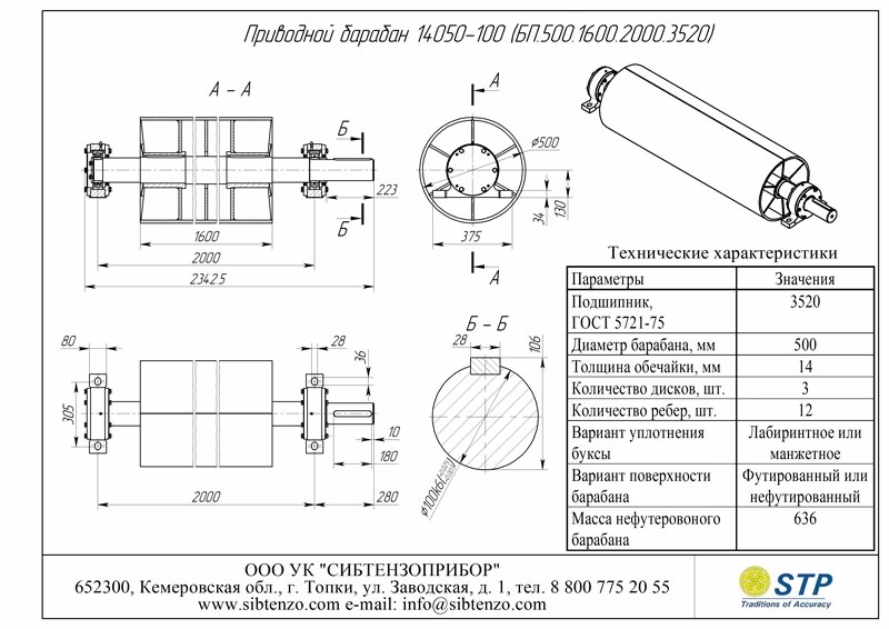 Шир. ленты В, мм Типоразмер приводного барабана Допуст. нагрузка Sб, даН Условное обозначение подшипника Размеры, мм Масса, кг Чертеж